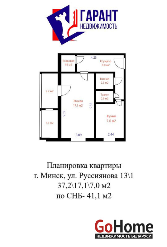 В квартире есть просторная комната — 17,1 м2, светлая кухня — 7 м2, большая застекленная лоджия —7,8 м2, которая идеально подойдет для отдыха или организации рабочего пространства.