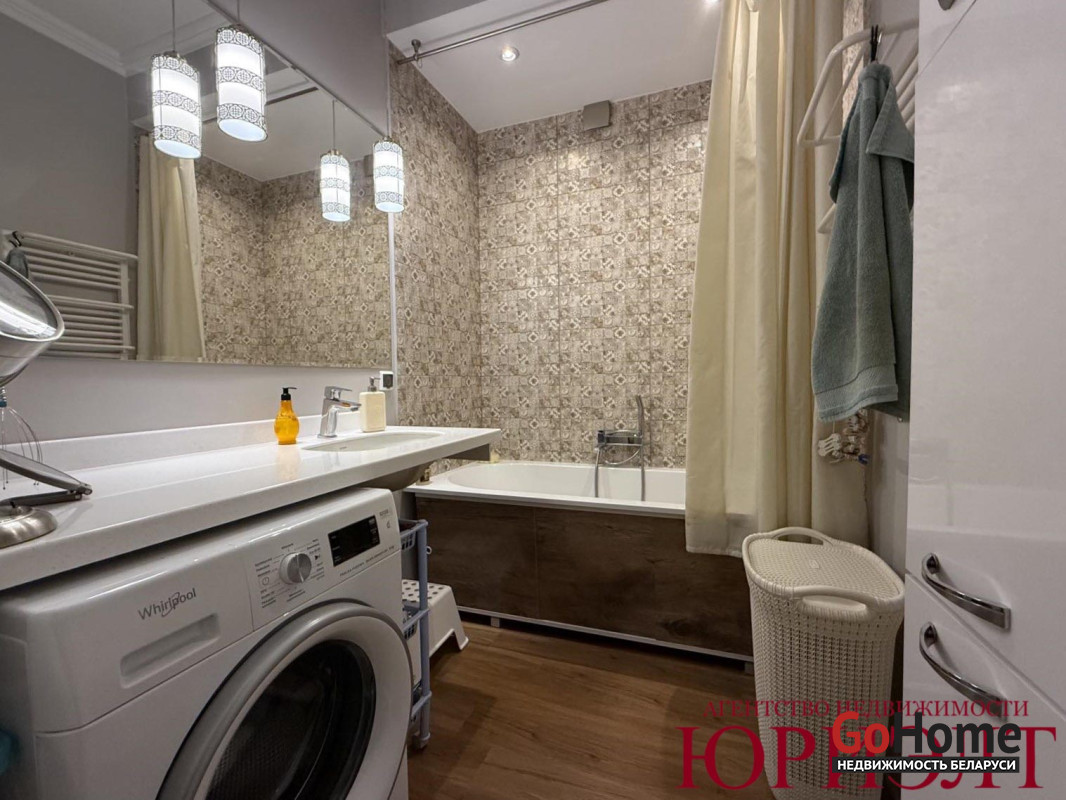 - подвесная мойка Franki (вместительная, с толстыми стенками и шумоизоляцией). Варочная поверхность и электродуховка Gorenje, вытяжка Elica 80см, посудомоечная машина Bosch с лазерным лучом-индикатором времени работы. Все подоконники – искусственный камень, на кухне выполнен единым полотном со столешницей (для этого нижний ряд кухни выполнен по уровню выше стандартного). В ванной единая столешница из искусственного камня с врезной мойкой, квариловая ванна.