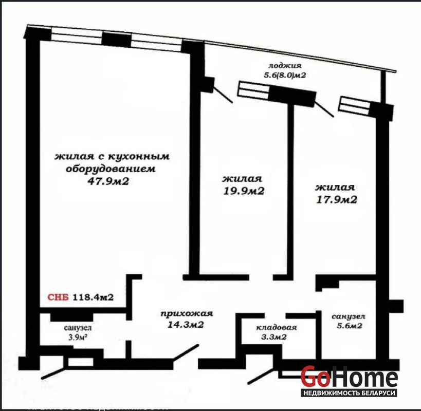 1. Отличная планировка: общая площадь по СНБ – 118,1 м2, жилая площадь – 85,4 м2, кухня – 20 м2, застекленная лоджия - 8 м2.