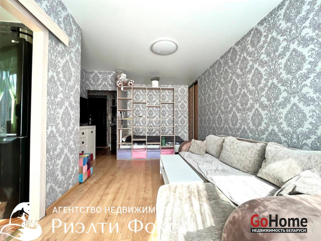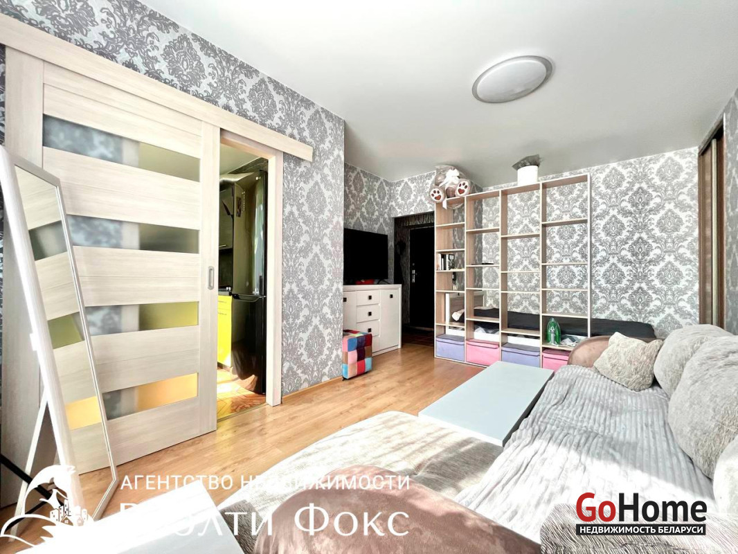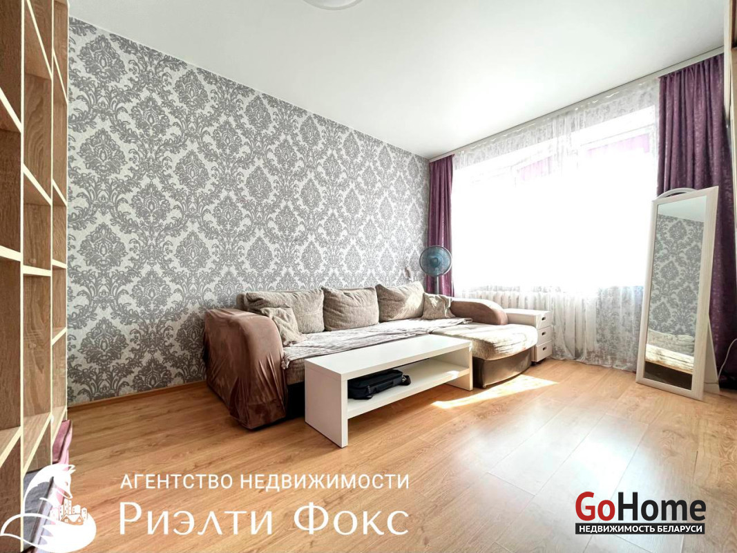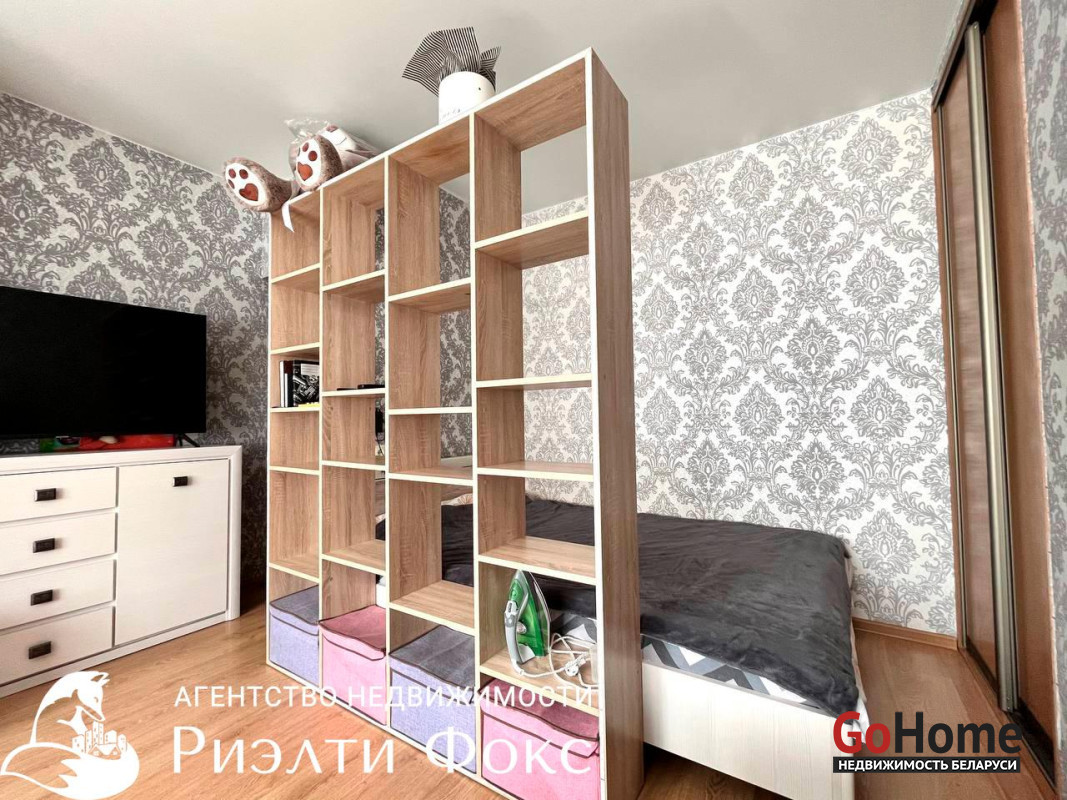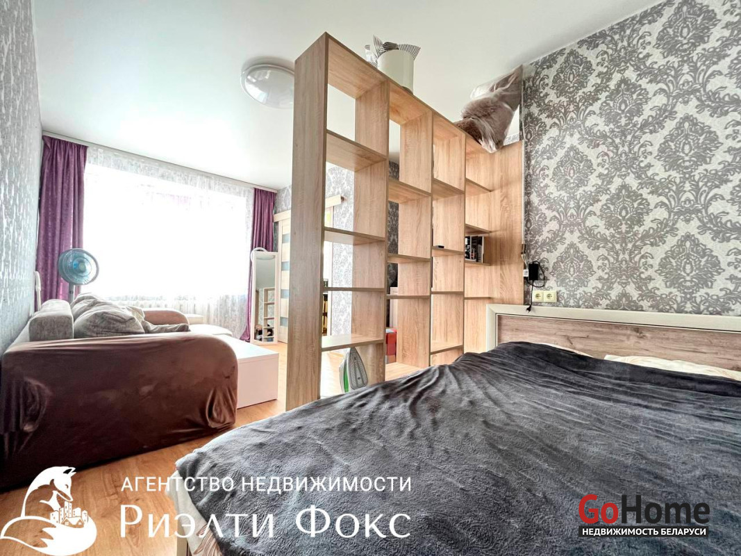 ПРОСТОРНАЯ: имеется кровать, шкаф-купе, достаточно места для дивана, комода и стеллажа