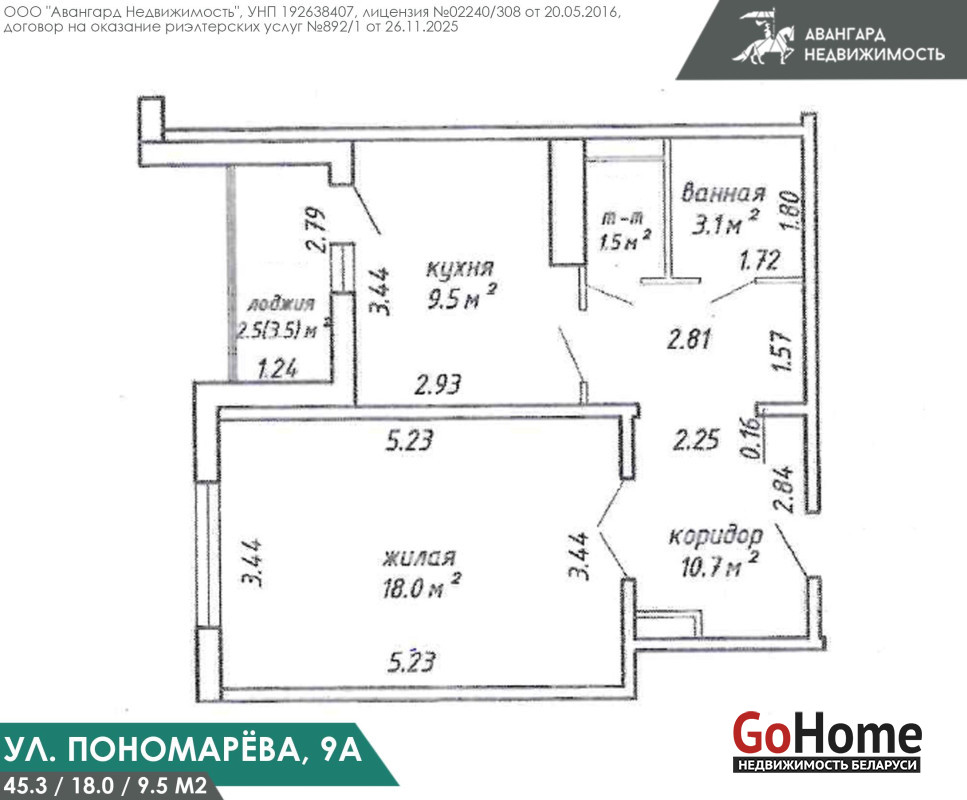 Общая площадь квартиры по СНБ - 45.3 м2/ Общая 42.8 м2;Жилая площадь - 18.0 м2 / Кухня - 9.5 м2
