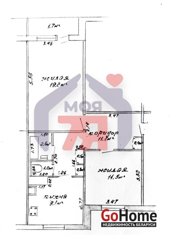 - Общая площадь - 57,5 кв.м, жилая - 30,7 кв.м, кухня - 9,1 кв.м. Застеклённая лоджия.