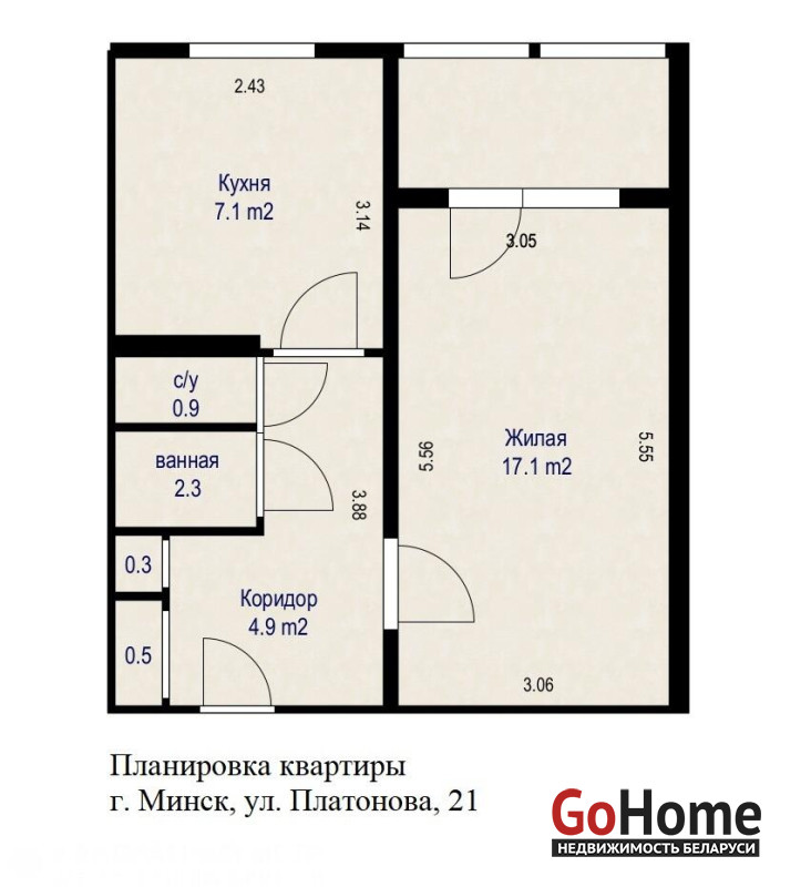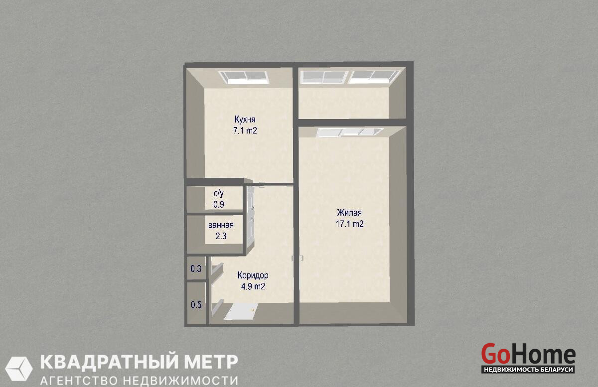 Отличная планировка: Просторная кухня (7,1 м2), светлая комната (17,1 м2) с выходом на застекленную лоджию, раздельный санузел, шкаф-купе в коридоре. Общая площадь по СНБ — 35,3 м2.