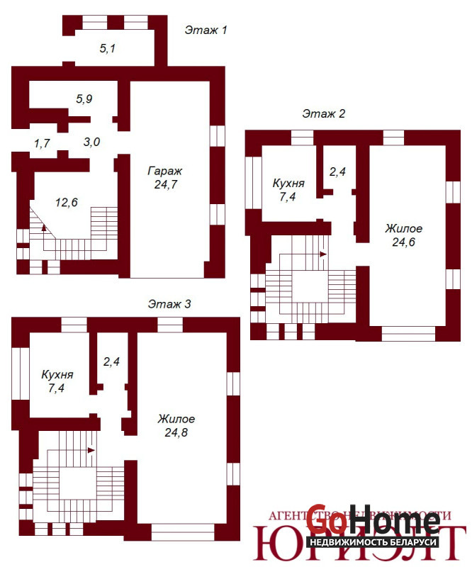На первом этаже расположены: банный комплекс и хозблок. На втором этаже кабинет, санузел, кухня-гостиная с остекленной лоджией. Третий: 2 спальни, просторная ванная с выходом на балкон, гардеробная.