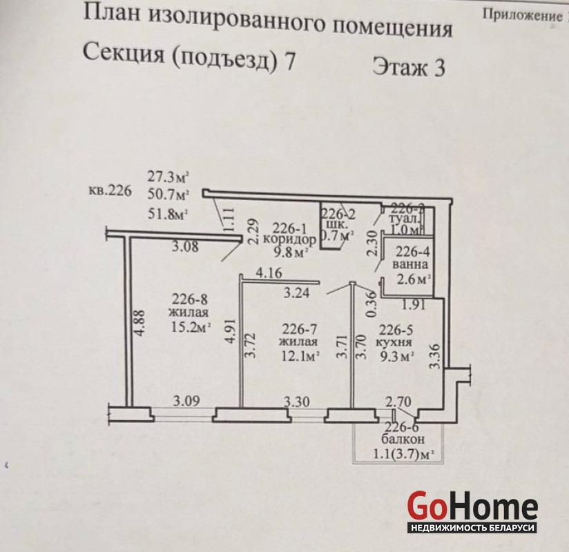 3/9 этаж, общая площадь 50.7 м2, жилая 27.3 м2, кухня 9.3 м2.