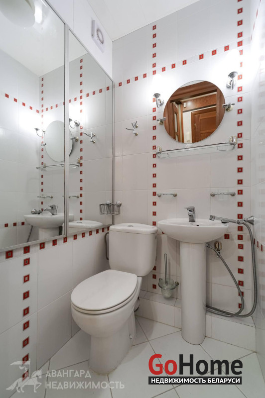 Ванная комната 5.0 м.кв оборудована большой французской ванной, умывальником со шкафчиком Германия, душевой кабиной, унитазом Испания с аквастопом и псевдобиде. Есть большое зеркало. Гостевой санузел так же имеет унитаз с аквастопом, псевдобиде, умывальник и зеркало. Есть и встроенный шкаф с оригинальным зеркальными створками, где хранятся средства для чистки и установлен бойлер на случай отключения воды горячей.