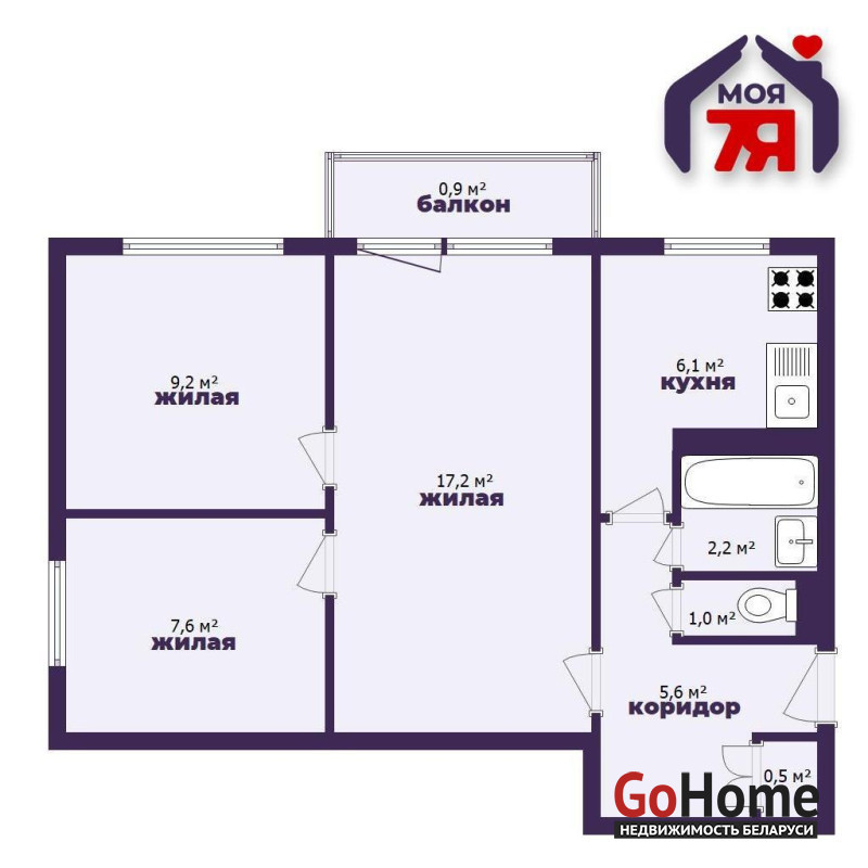 - 3 жилые комнаты: 1 проходная 17,2 кв.м. и 2 изолированные 7,6 и 9,2 кв.м.