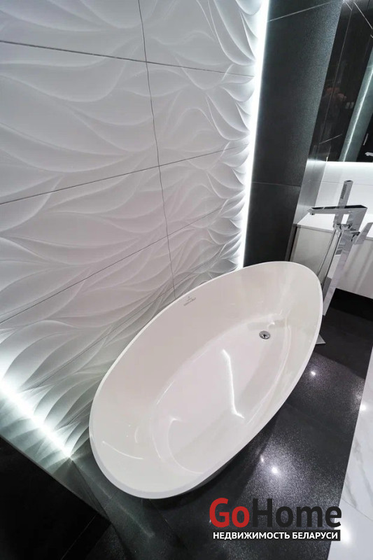 На кухне и в санузле - цельная столешница из искусственного камня без шва.