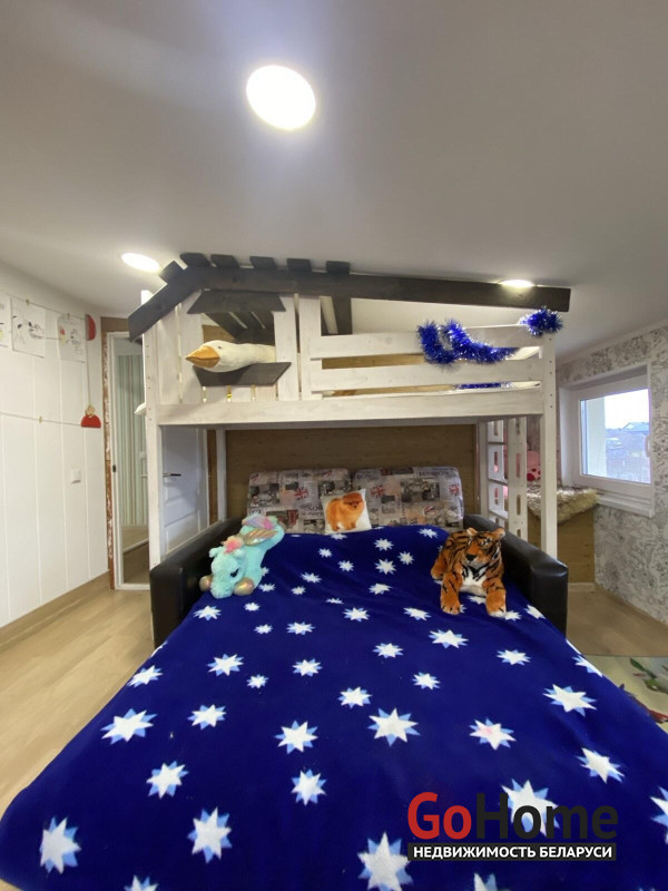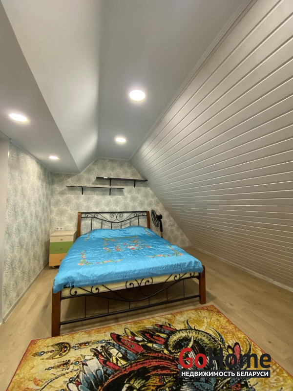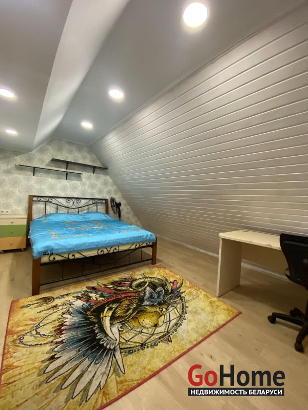 На мансардном этаже расположены две комнаты. Уютная детская комната оборудована двухэтажной кроватью в виде домика, встроенными шкафами и графитной стеной для рисования. Спальня оформлена с кованой кроватью и ортопедическим матрасом, встроенным шкафом и рабочим столом. К дому пристроена летняя кухня.