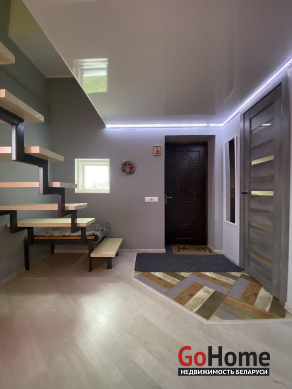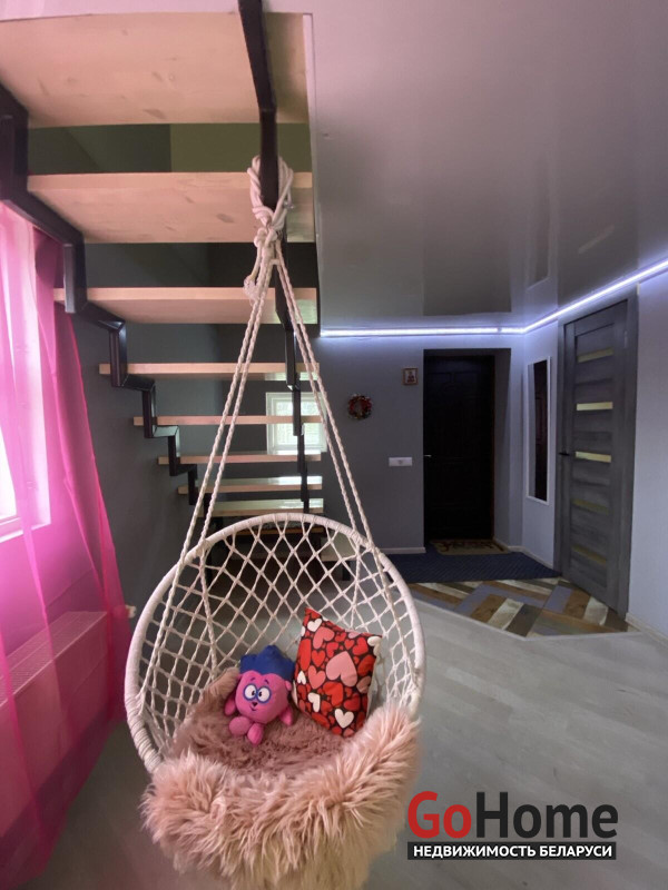Дача была построена в 2017 году и состоит из одного этажа с мансардой, общей площадью 74,8 кв.м. На первом этаже расположены кухня-гостиная, оборудованная большой столешницей, электродуховкой, газовой плитой, холодильником и микроволновой печью. Гостиная оформлена с удобным раскладывающимся диваном, большим телевизором и подвесной качелью. Также на первом этаже находится совмещённый санузел со стиральной машиной и котельная.