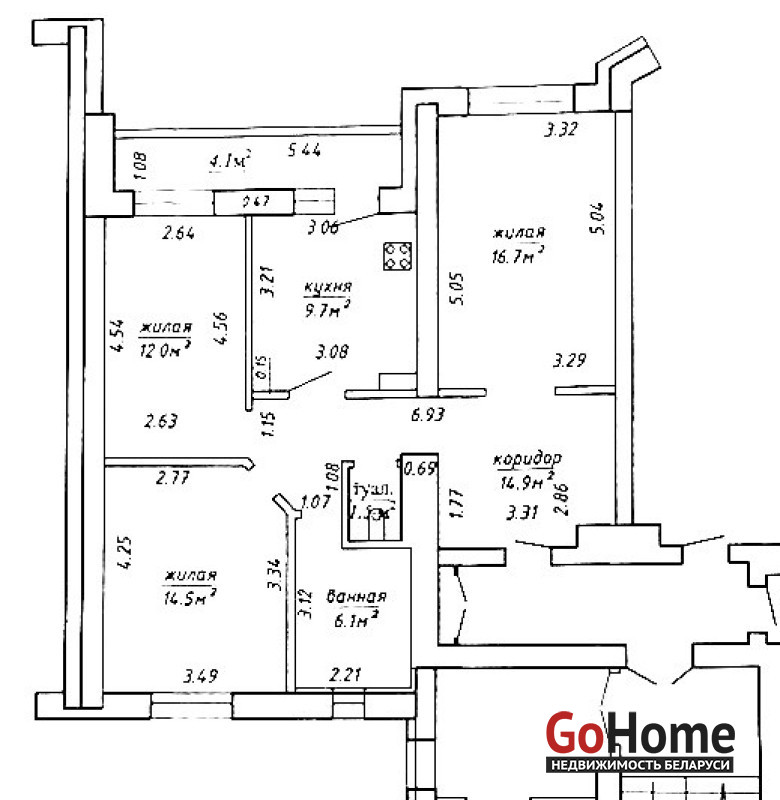 Параметры квартиры: общая площадь- 75,4 кв м, жилая площадь - 43,2 кв м, кухня- 9,7 кв м.