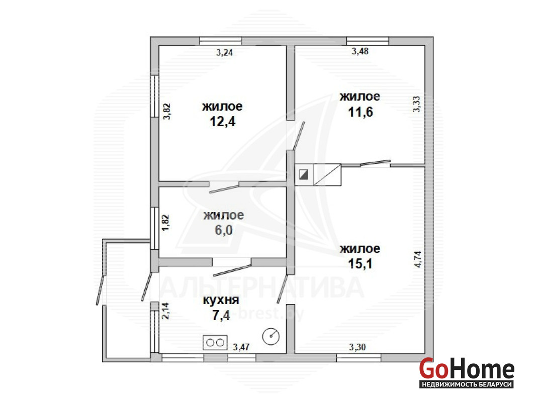 Жилой дом в г.Бресте. 1 этаж. Общ.СНБ - 54,9 кв.м, общ.- 52,5 кв.м, жил.- 45,1 кв.м, 4 комнаты, высота потолка - 2,40 м.