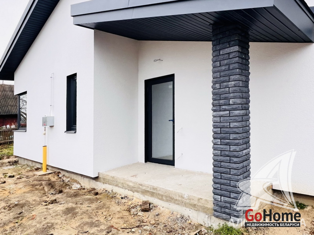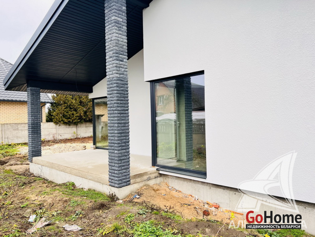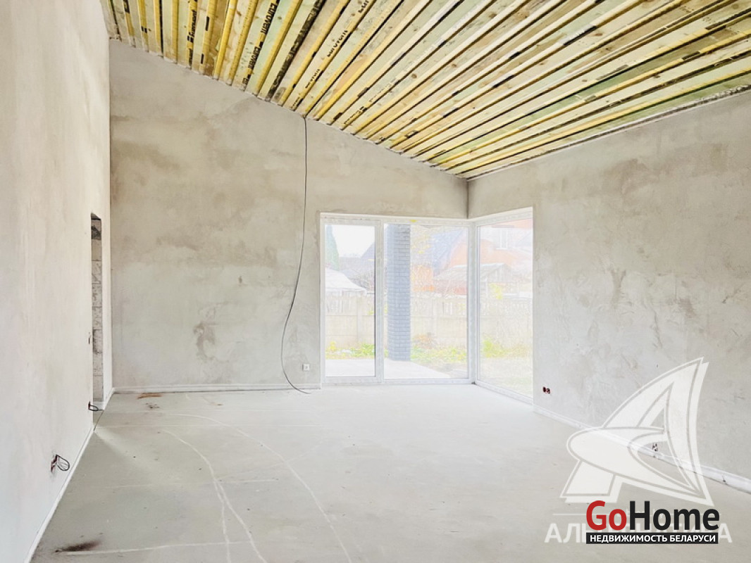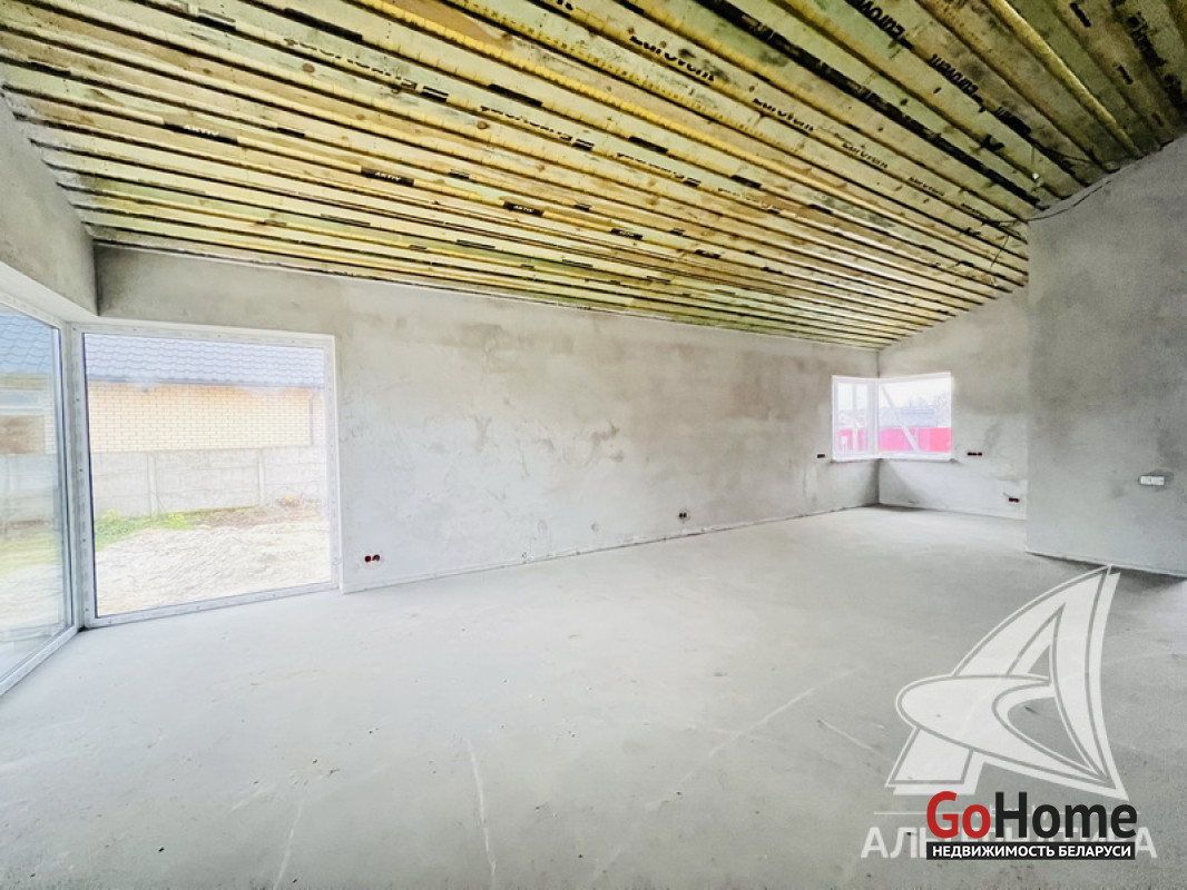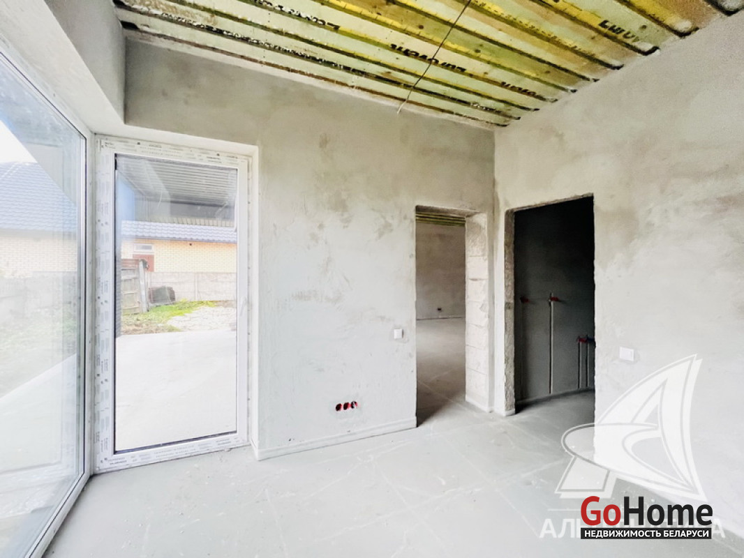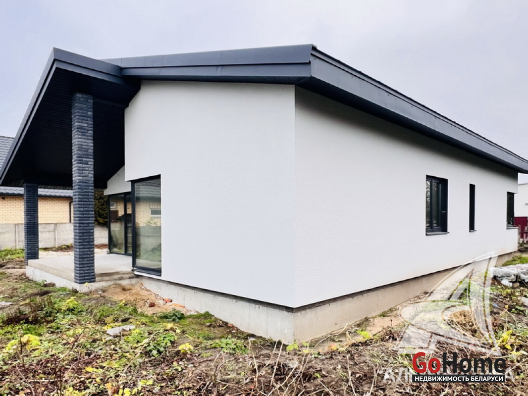 Жилой дом под чистовую отделку в Брестском р-не. 2025 г.п. 1 этаж. Общ.СНБ - 124,4 кв.м, общ.- 124,4 кв.м, жил.~ 80,0 кв.м, кух.~ 15,0 кв.м. 4 комнаты, высота потолка - 2,80 м.