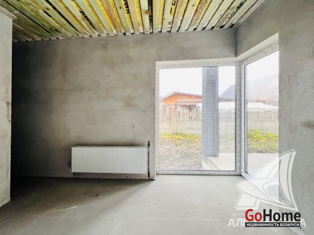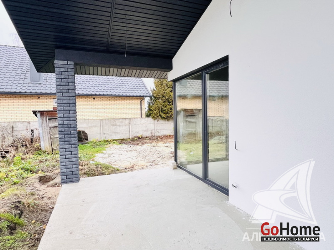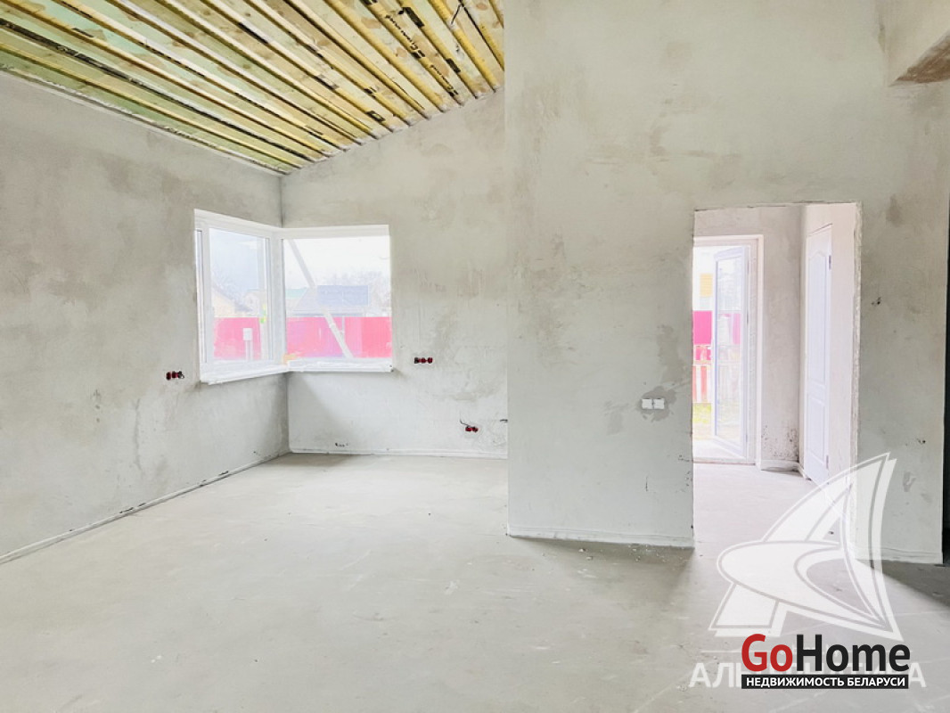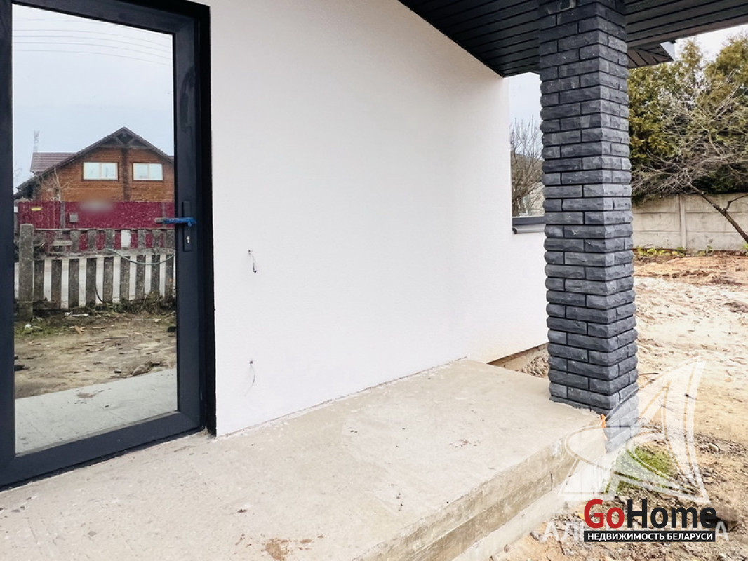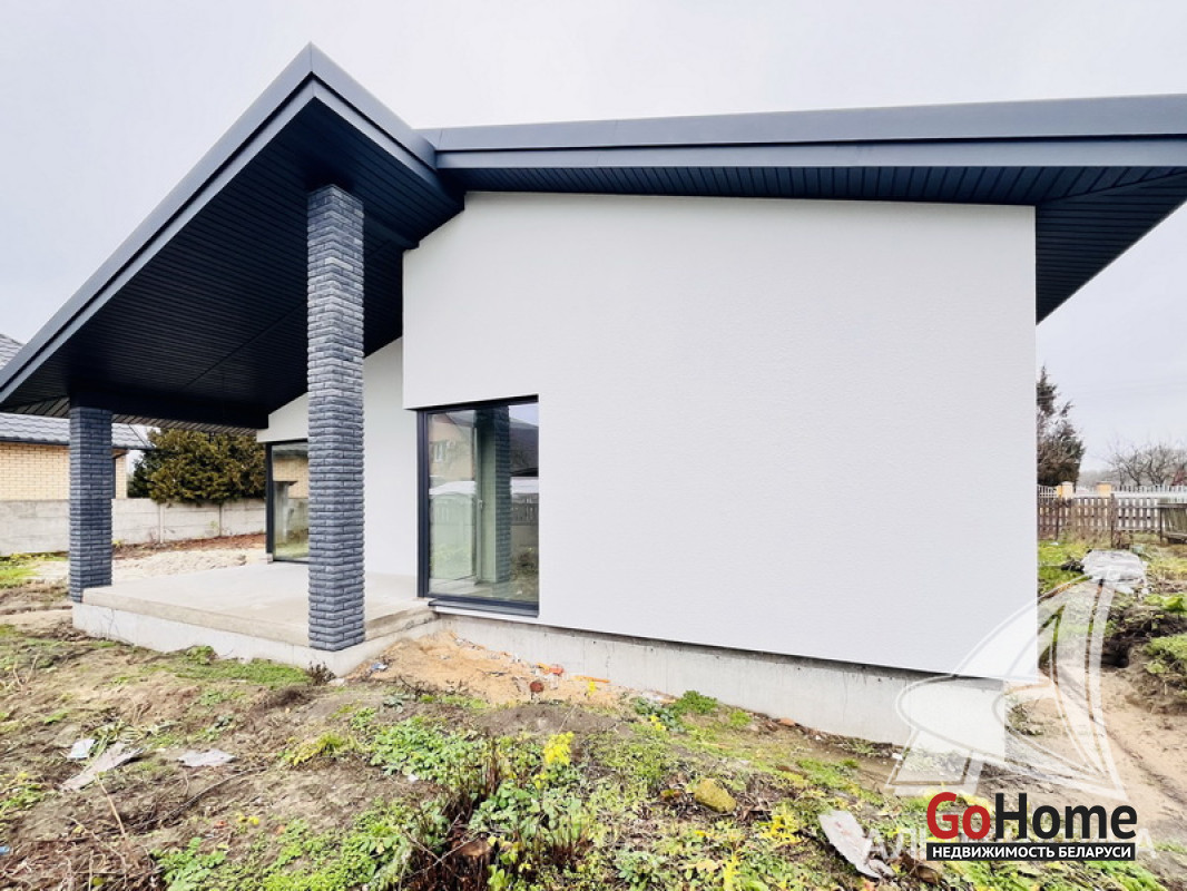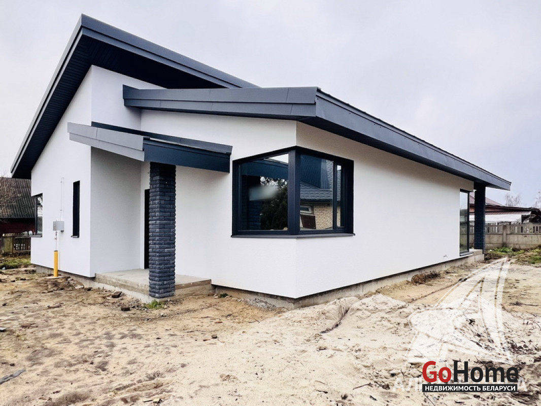 Жилой дом под чистовую отделку в Брестском р-не. 2025 г.п. 1 этаж. Общ.СНБ - 124,4 кв.м, общ.- 124,4 кв.м, жил.~ 80,0 кв.м, кух.~ 15,0 кв.м. 4 комнаты, высота потолка - 2,80 м.