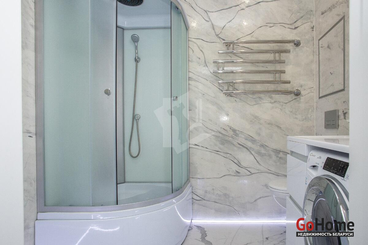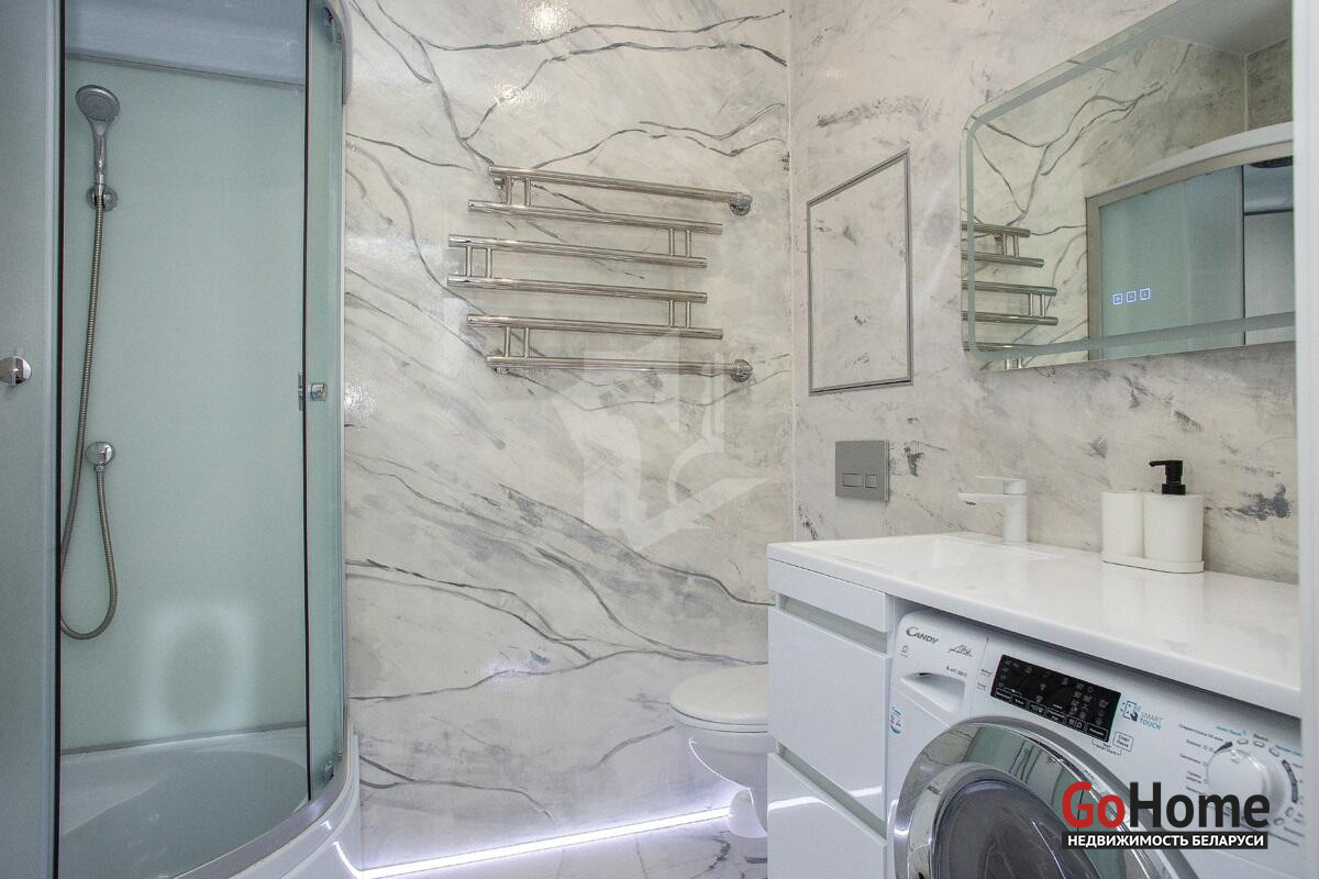 Санузел – совмещенный, 4 м2, стены покрыты эпоксидной смолой – самой эффективной гидрозащитой, на стене расположено зеркало с подсветкой и встроенной музыкальной системой, установлен проточный водонагреватель, душевая кабина (место позволяет разместить ванну) и стиральная машина, что обеспечивает комфорт и функциональность.