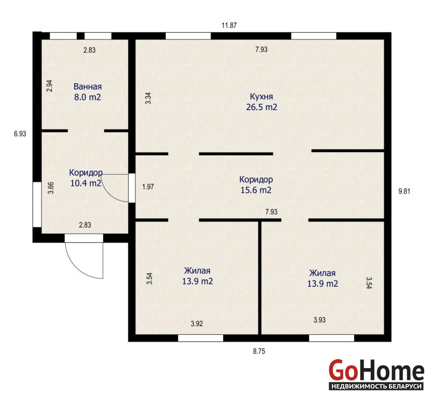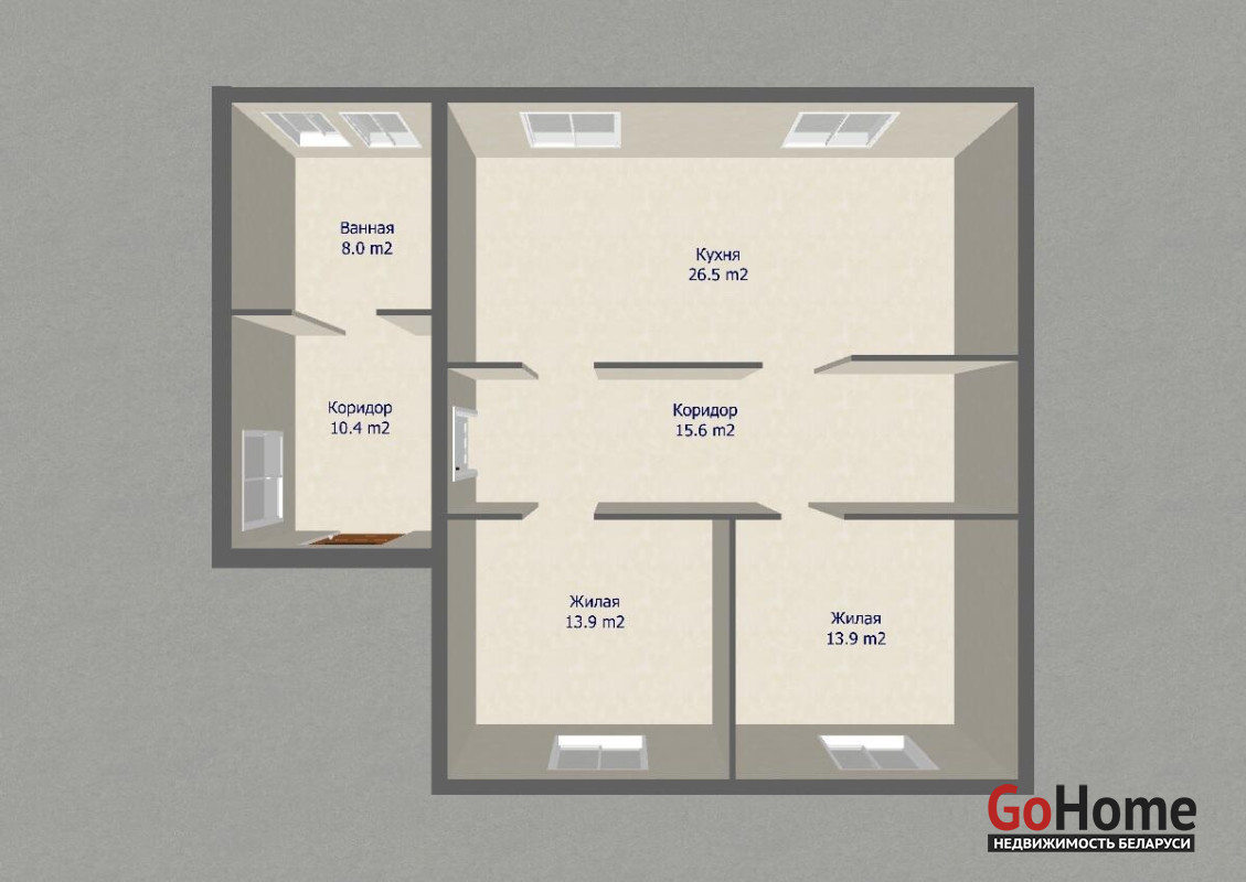 В доме 2 комнаты, просторная кухня с гостиной, гардеробная комната, сан. узел и топочная. Возможность оборудовать второй этаж.