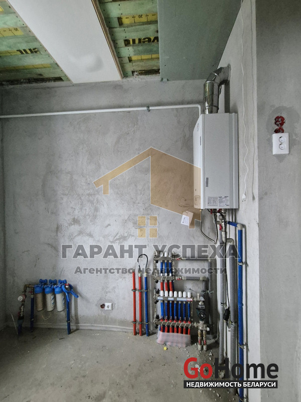 Дом накрыт металлочерепицей, наружные стены покрыты камешковой штукатуркой. Стены пошпаклёваны, разведены выключатели и розетки, разведена сантехника с циркуляцией ГВС. Окна ПВХ с ламинацией. В котельной установлены гребенки на большое количество контуров и дополнительный насос подмеса. Электрика разведена на контура.