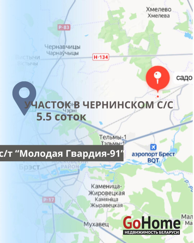 Продаётся участок в Брестском районе, в садовом товариществе "Молодая Гвардия", площадью 5.5 соток. На участке имеется водоснабжение (колонка), электричество, а газ находится рядом. Участок не огорожен. В ближайшем будущем планируется строительство дороги. Рядом находится остановка, где останавливаются маршрутки в направлении Жабинки, а также недалеко расположена железнодорожная станция. Садовое товарищество активно застраивается домами.