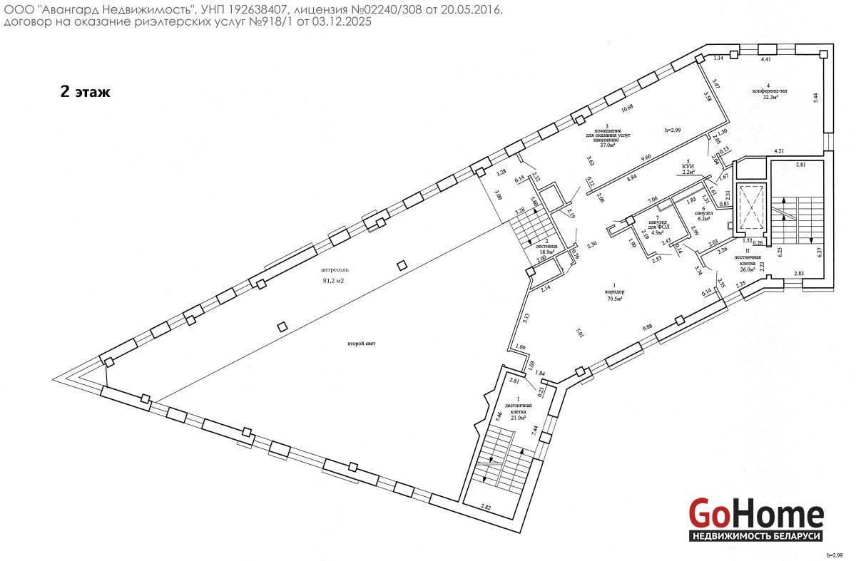 - высота потолков: основная – 2.99 м, первый этаж – 8.35 м;