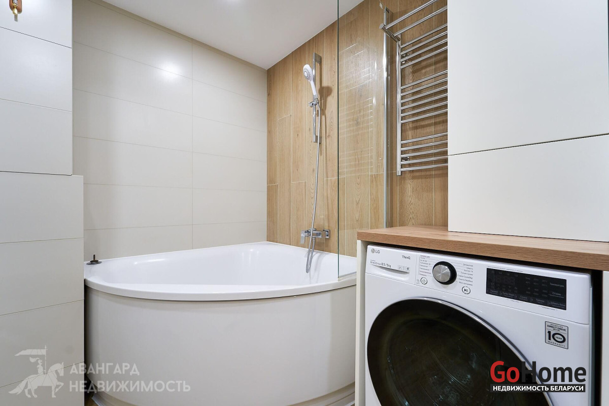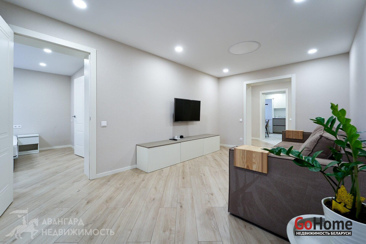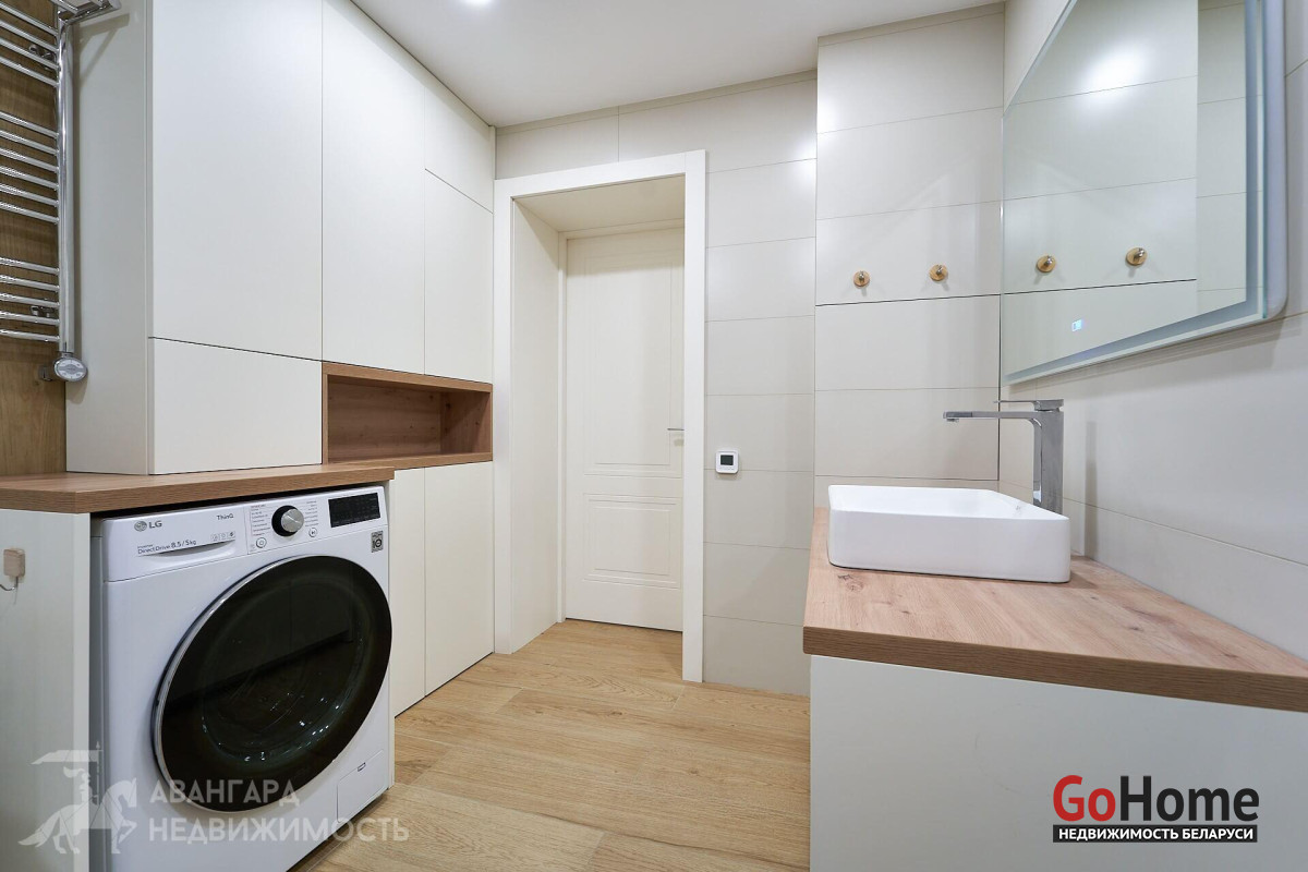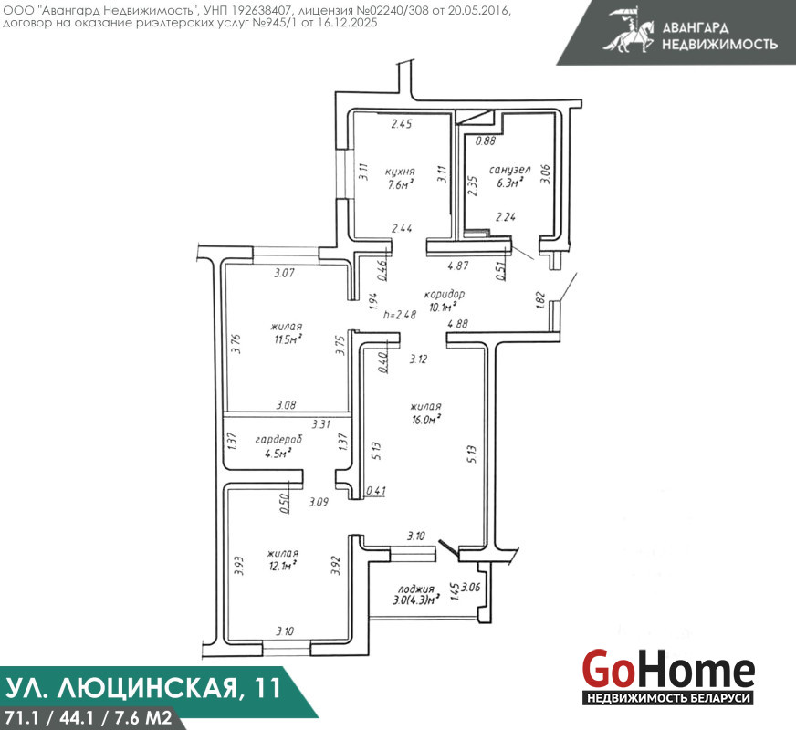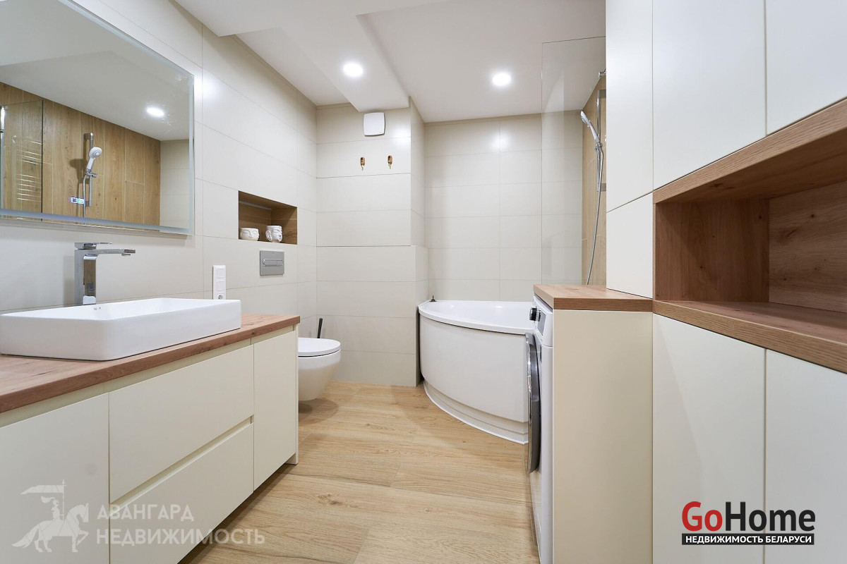 Площадь квартиры по СНБ 71.1 м2. Высота потолков составляет 2.55 м. В квартире официально согласована перепланировка. Так же важным плюсом является то, что по всему периметру квартиры проведена шумоизоляция помещения, стены и потолок. Квартира с удобной планировкой. Три жилые комнаты: изолированная 11.5м2, 16м2 с выходом на застекленную лоджию, установлен кондиционер инвертор (охлаждение и обогрев), 12.1м2 с удобной гардеробной (много систем хранения, зеркало, шкаф). Площадь кухни 7.6м2 оснащена качественной встроенной техникой, укомплектованапосудомоечная машина, духовой шкаф, индукционная плита, встроенная микроволновая печь, холодильник, (вся техника Bosch). Проточный фильтр для воды 3 ступени. Санузел совмещён, в ванной комнате итальянская плитка и керамогранит, проведен тёплый пол, большая угловая ванна, проточный водонагреватель 6кв, сантехника с системой Roca, электрический полотенцесушитель, стиральная и сушильная машина LG на 8.5 кг. Также в квартире установлены трехкамерные стеклопакеты от производителя Rehau, межкомнатные двери из массива со скрытыми и магнитными петлями, ламинат класса 33 Villeroy & Boch.
