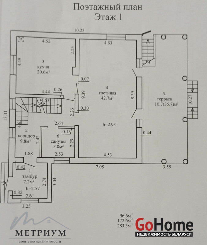 Общая площадь составляет - 172,6 кв.м., жилая – 96,6 кв.м., кухня – 20,6 кв.м.