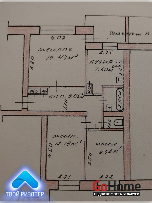- жилые комнаты площадью: 15,2; 12,2; 9,5 кв.м., имеется лоджия