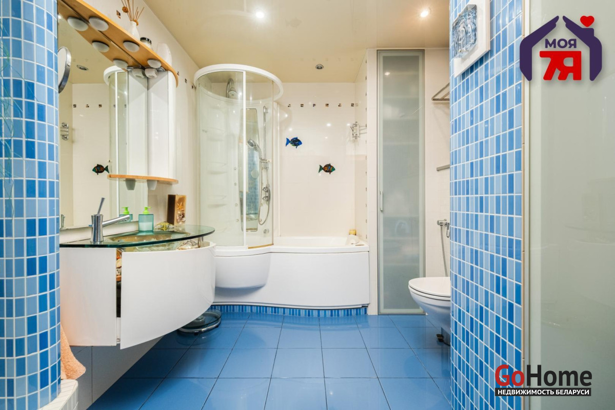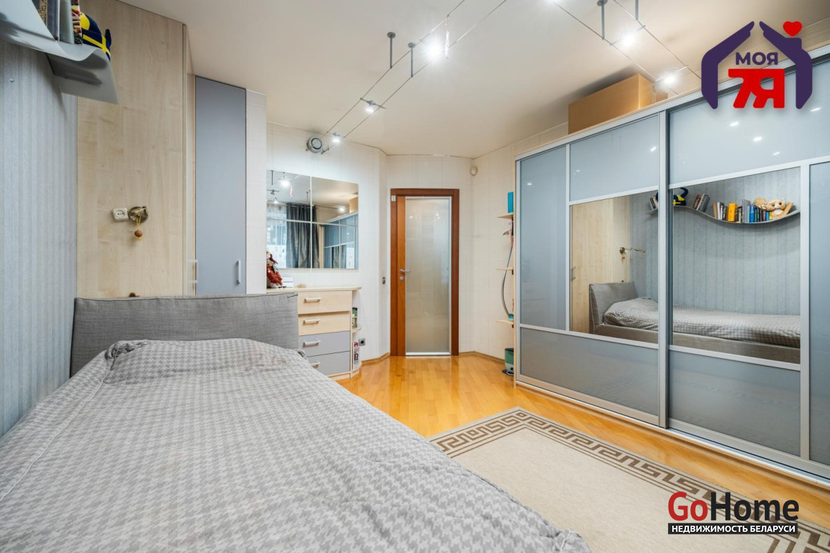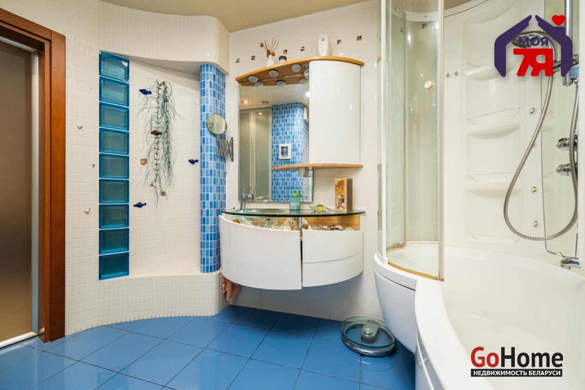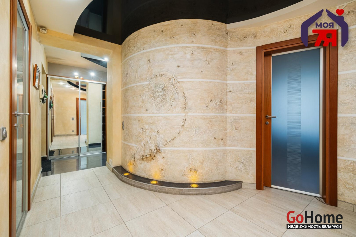 - Общая площадь квартиры 123,2 кв.м, жилая площадь 64,5 кв.м, кухня 30,7 кв.м.- Квартира полностью готова к проживанию. Выполнен евроремонт с использованием качественных материалов, остаётся вся мебель.- Пол выложен итальянской мраморной плиткой с системой тёплых полов. Стены оформлены венецианской штукатуркой, подчеркивающей статус интерьера.- Основная ванная отделана итальянской плиткой и оборудована ванной с душевой кабиной Jacuzzi. Установлены сушильная машина Miele, сантехника Hans Grohe, зеркало с подсветкой и аксессуары итальянского производства. Натяжной потолок завершает интерьер.- Мебель Valcucine из Италии, столешницы и обеденный стол из натурального мрамора. Варочная поверхность AEG на пять конфорок, вытяжка «Крыло» с пятью режимами работы. Холодильник Samsung Side by Side с подачей воды и льда, духовой шкаф Bosch с функцией СВЧ, посудомоечная машина AEG. Встроена система очистки воды с угольным фильтром и обратным осмосом.- Немецкий электрический камин с облицовкой из камня Glivi формирует атмосферу стильного пространства. Подоконники и полка под телевизор выполнены из того же камня. Австрийские хрустальные люстры завершают облик. В каждой комнате установлены кондиционеры.- Квартира расположена на 2 этаже 14-иэтажного кирпичного дома 2004 года постройки. Подъезд оборудован охраной и видеонаблюдением. В крытом паркинге выкуплены два машино-места.- Пять минут пешком до метро «Пролетарская», десять минут до «Площади Победы». Поблизости находятся школы, гимназии, детские сады, банки, магазины, фитнес-клубы и кинотеатры. В шаговой доступности Комаровка, ЦУМ, парк Горького, набережная Свислочи, рестораны и кафе. Сквер имени Симона Боливара - у самого дома.