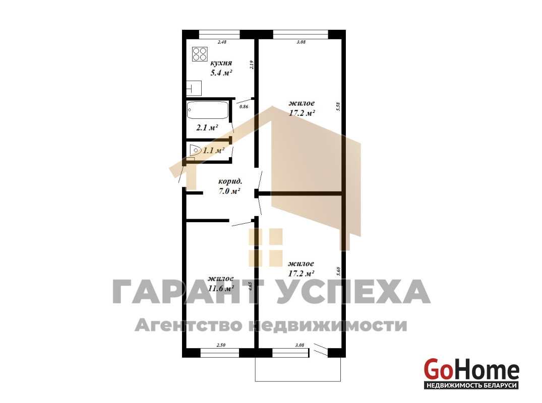 Удобная планировка: три жилые комнаты (17,2 м², 17,2 м² и 11,6 м²), раздельный санузел. В квартире имеется застеклённый балкон с выходом из спальни.