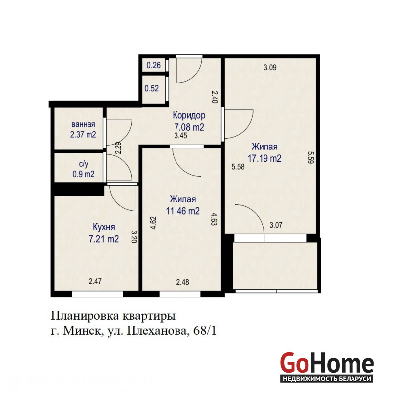 Рациональная планировка, площадь 47 м. кв. Квартира расположена на 1 этаже из 9. Жилая площадь - 28,65 м. кв. Комната 17,19 м. кв. и 11,46 м. кв. Площадь кухни 7,21 м. кв. Достаточно места для дружной семьи.