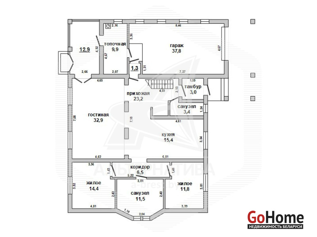 Жилой дом в г.Бресте. 2011 г.п. 1 этаж. Общ.СНБ - 184,0 кв.м, общ.- 133,3 кв.м, жил.- 59,1 кв.м, кух.- 15,4 кв.м. 3 комнаты, высота потолка - 2,90 м.