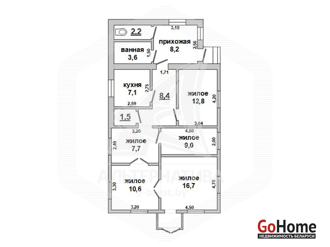 Жилой дом в г.Бресте.1 этаж. 1928 г.п., Общ.СНБ - 90,2 кв.м, общ.- 87,8 кв.м, жил.- 47,8 кв.м, кух.- 7,1 кв.м. 5 комнат.