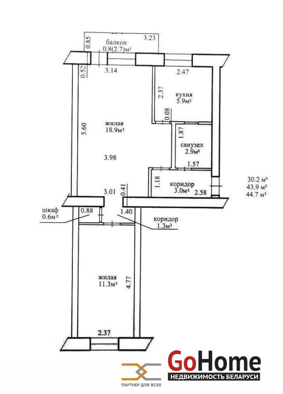 Продается 2-комнатная квартира в г. Минске, по ул. Волоха, 59. Площадь квартиры по СНБ 44.7 м.кв, жилые комнаты 18.9 м.кв. и 11.3 м.кв., кухня 5.9 м.кв.