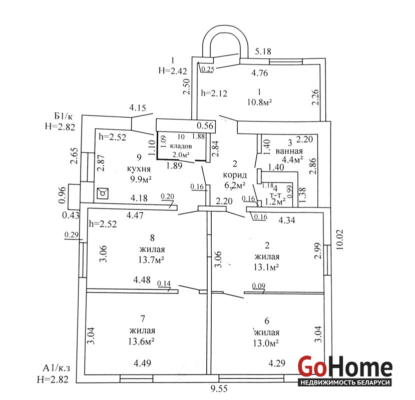 Общая площадь дома составляет 87.9 кв.м., из которых 53.4 кв.м. – жилая площадь, а 9.9 кв.м. занимает кухня. Дом построен из дерева и облицован кирпичом, что обеспечивает надежность и теплоизоляцию. Крыша покрыта шифером, а окна частично заменены на ПВХ, что добавляет современности и энергоэффективности. Высота потолков в доме – 2,82 м, что создает ощущение простора и свободы.