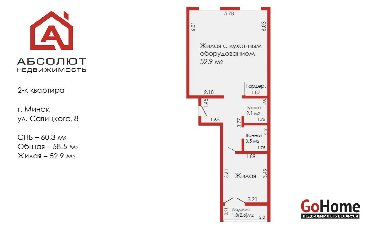 Квартира расположена на 14 этаже 15-этажного дома. Общая площадь по СНБ — 60,3 кв. метров.