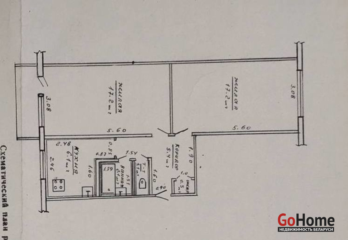 Общая площадь: 49,6 м2, жилая площадь: 34,4 м2, кухня: 6,1 м2