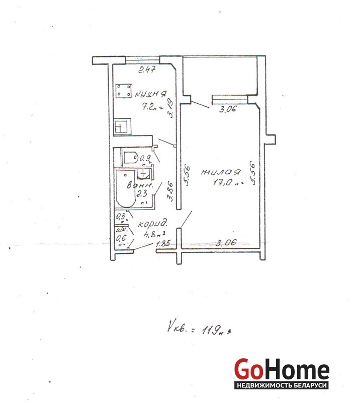 - Общая площадь квартиры составляет 33,1 кв.м, жилая площадь 17 кв.м, кухня 7,2 кв.м.