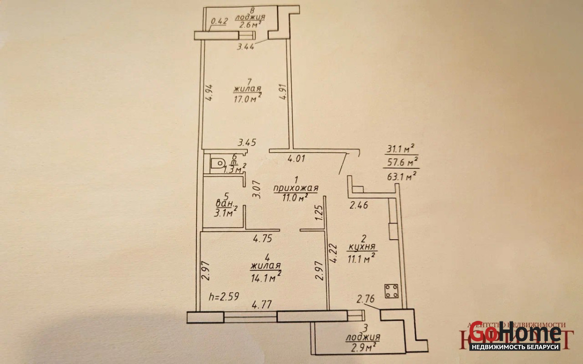 Общей площадью 63.1м2, жилая 31.1м2, большая кухня 11.1м2 мечта любой хозяйки.