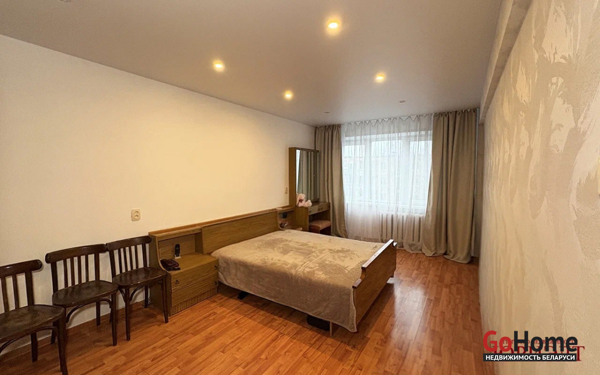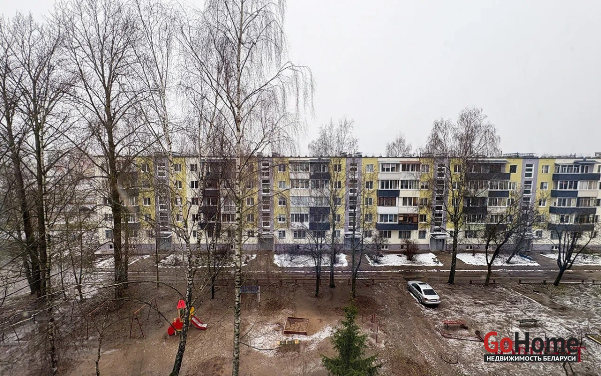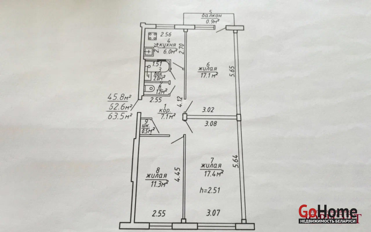 Общая площадь 63,5 м², жилая 45,8 м², кухня 6,0 м². Расположенная на 5-м последнем этаже, она предлагает потрясающий вид и тишину. Все окна — ПВХ, кроме одного между комнатой и балконом, что добавляет особый уют.
