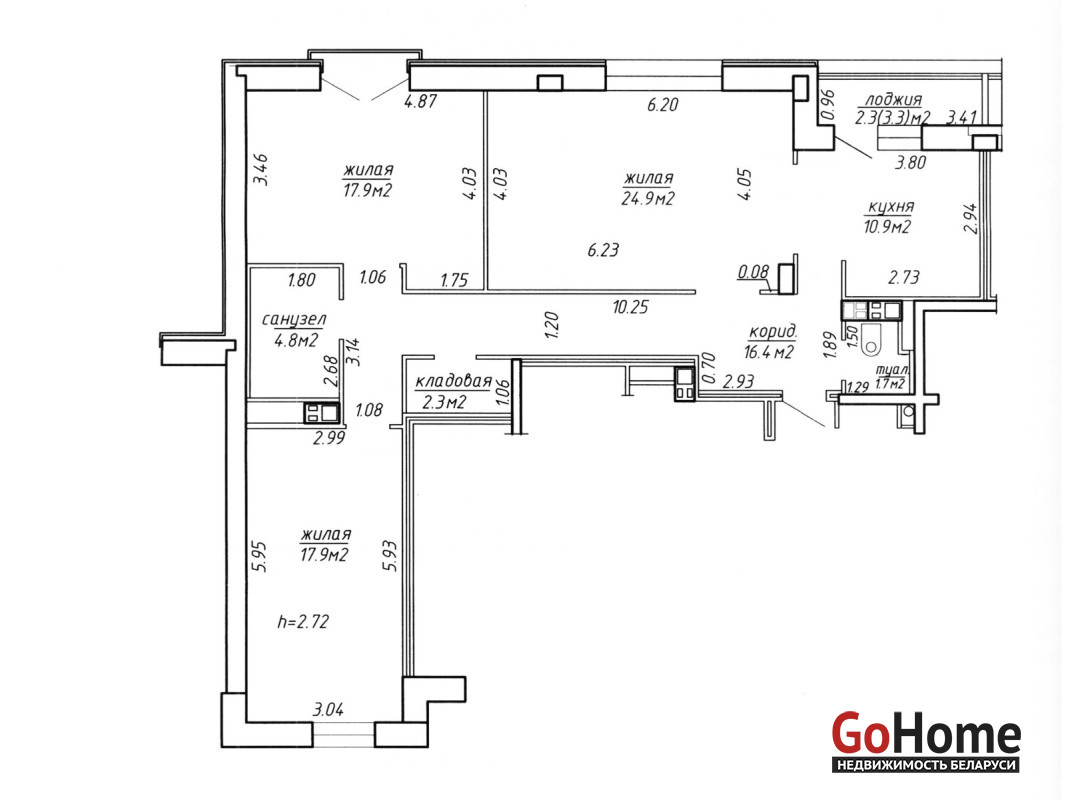 Удобная продуманная планировка. Общая площадь квартиры 96.8м2 (по СНБ 99.1м2). Жилая 60.7м2 состоит из просторной гостиной 24.9м2, уютной спальни 17.9м2 с двумя гардеробами и зонированной детской комнаты 17.9м2. Просторная кухня 10.9м2, два санузла, большая оборудованная гардеробная 2.3м2, застекленная лоджия 3.3м2. Высота потолков 2.72м. Окна выходят на разные стороны. Квартира расположена на 2 этаже 10 этажного блочного дома (2015 г.).