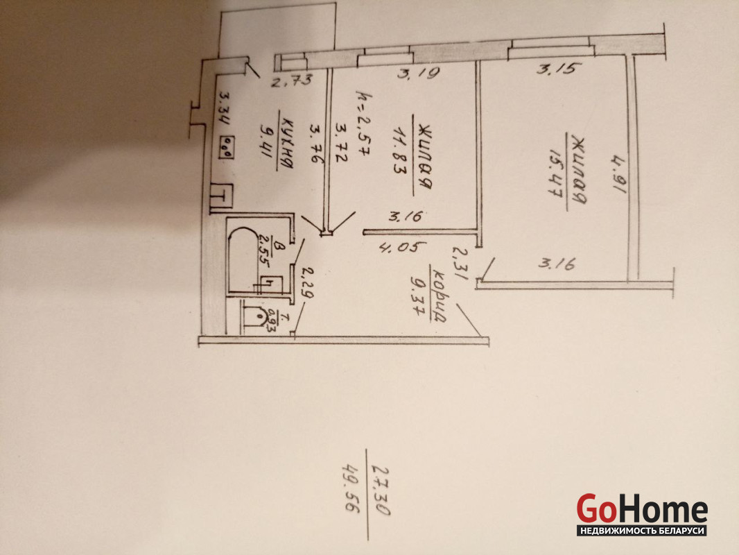 Общая площадь квартиры составляет 49,56 кв. м, жилая — 27,3 кв. м, кухня — 9,4 кв. м.