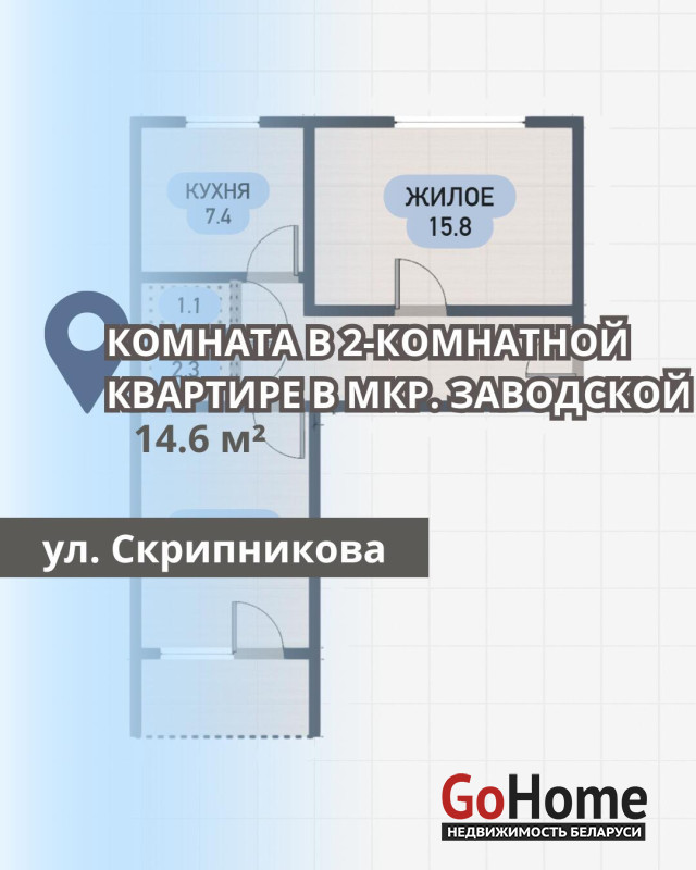 Подписывайтесь на наш instagram @ecrzby для удобного слежения за новыми актуальными объектами.Продается комната в 2-комнатной квартира на улице Скрипникова, расположенная на втором этаже 5-этажного кирпичного дома, построенного в 1975 году. Общая площадь квартиры составляет 51,8 м2, жилая площадь – 30,4 м2, а площадь кухни – 7,4 м2. Площадт продаваемой комнаты - 14.6 м2, с выходом на лоджию.