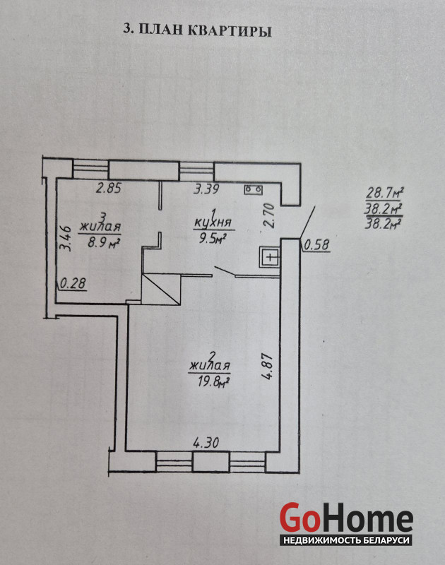 Площадь: 38.2 кв.м (жилая - 28.7 кв.м, кухня - 9.5 кв.м) – оптимальное пространство для жизни.