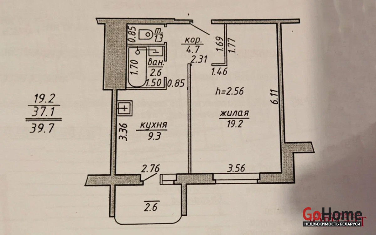 Общей площадью 39.7м2, жилая 19.2м2, кухня просторная 9.3м2.