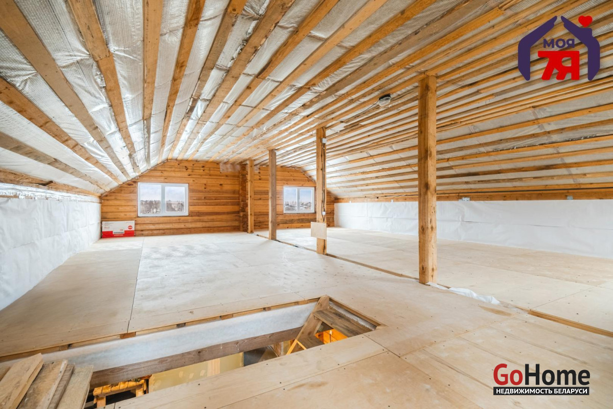 - На первом этаже выполнена бетонная стяжка, на втором — фанера, уложенная в уровень, готова к чистовой отделке. Мансарда утеплена современным материалом эковатой, который сохраняет тепло зимой и прохладу летом.