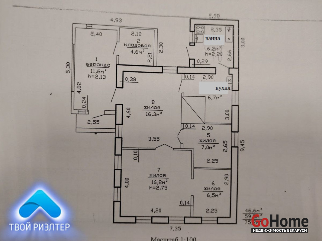- общая площадь по СНБ - 75,5 м.кв., общая площадь жилого помещения – 59,5м.кв., жилая площадь – 46,6м.кв.;