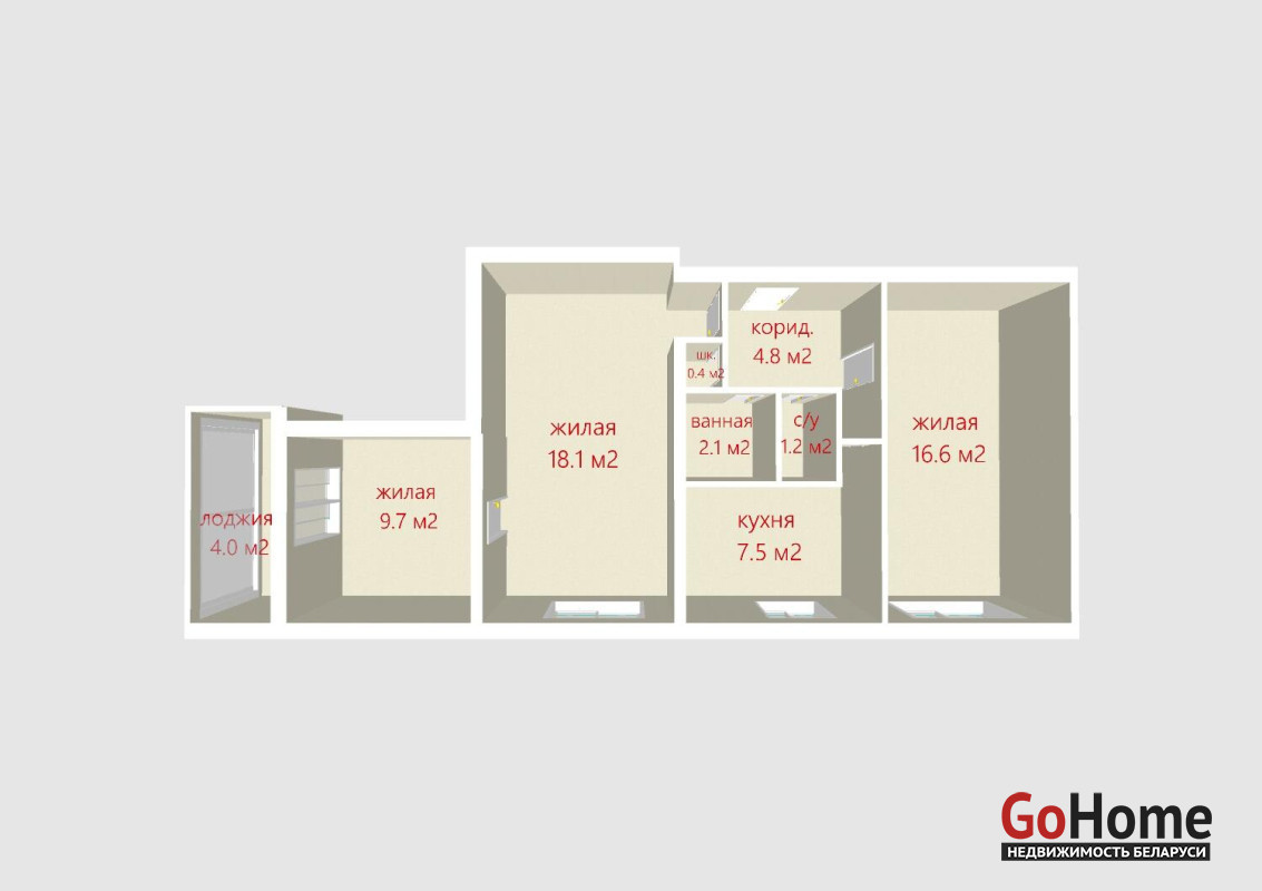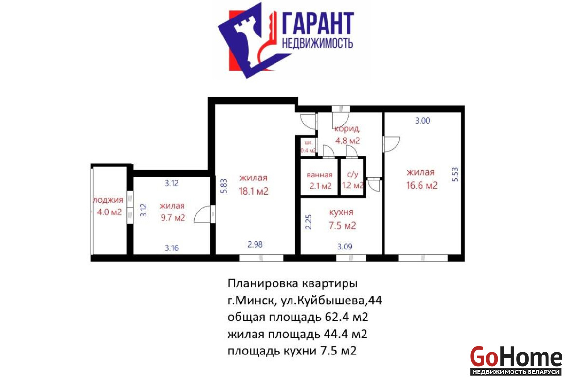 Площадь по СНБ 62,4 Общая площадь: 60,4 Жилая площадь: 44,4. Площадь кухни: 7,5.