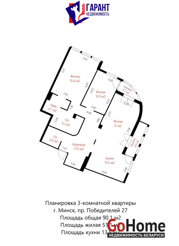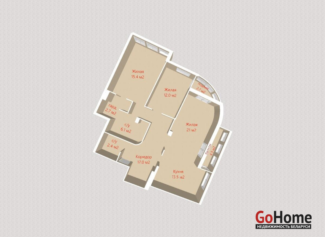 Просторная планировка – общая площадь 95.0 кв.м. Кухня 13,5 квадратов, гостиная 21,0 кв.м., две спальни 12,0 кв.м., и 15,4 кв.м. Отдельная гардеробна, а также постирочная.