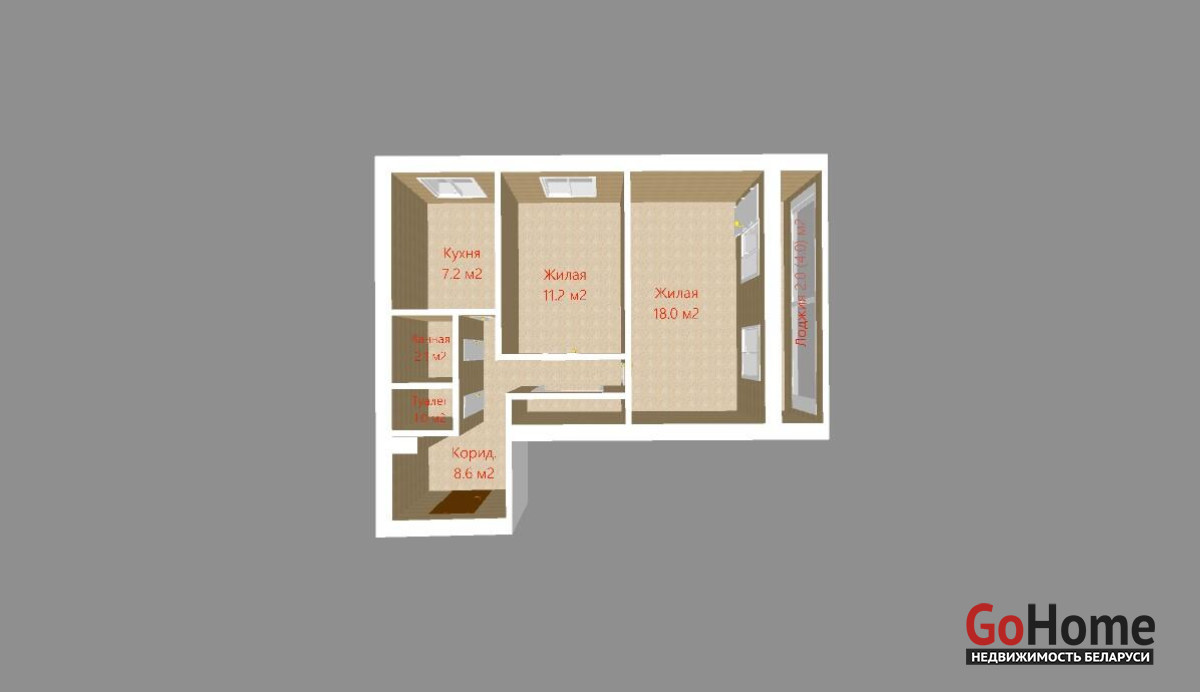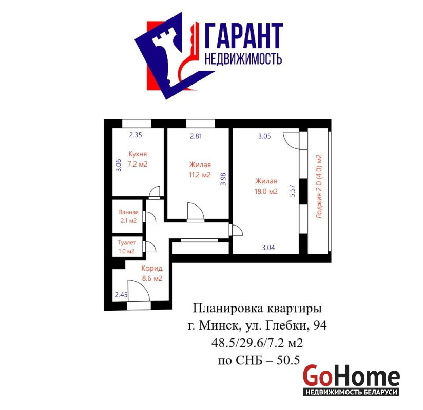 Площадь: СНБ – 50,5 м2/ Общая – 48,5 м2/ Жилая – 29,6 м2/ Кухня – 7,2 м2.