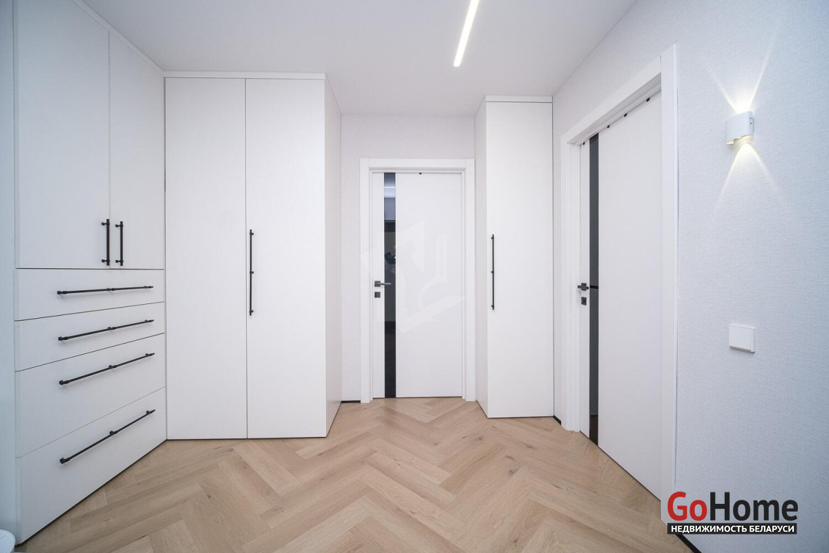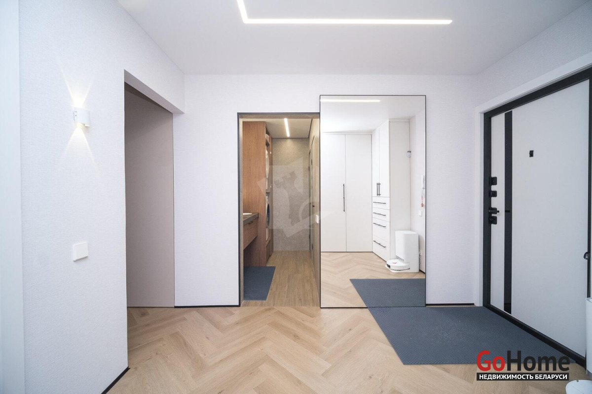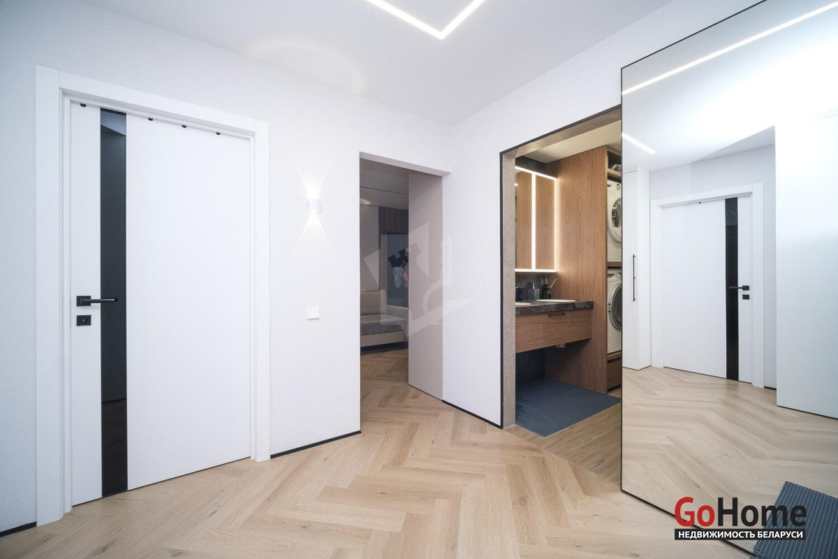 В квартире выполнен свежий дизайнерский ремонт. Сразу обращает на себя внимание многоуровневое фантазийное освещение. Не останется незамеченным современное покрытие пола замковым кварцвинилом: уложенный елочкой по всей квартире, без порогов, он создает единство стиля. Эстетика сочетается с практичностью и экологичностью