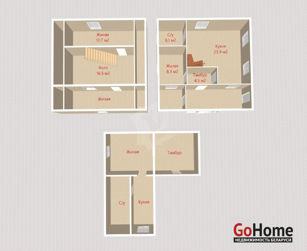 Основной дом 120 м2 (2 этажа, полностью с мебелью и оборудован техникой): 1 этаж: просторная кухня-гостиная, санузел, жилая комната, гардеробная, 2 выхода во двор. 2 этаж: две жилые комнаты и проходная комната. Вся техника входит в стоимость: встроенная кухня (варочная панель, духовка, вытяжка, посудомоечная машина, холодильник), бойлер, электрокотёл Коспел (льготный тариф на электроотопление).